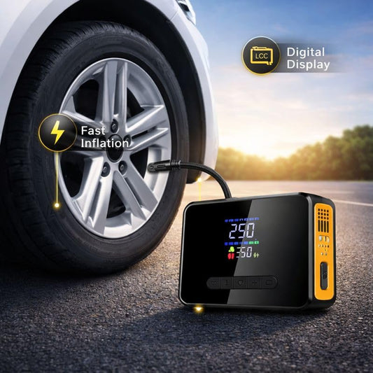 Portable Tyre Inflator with Jump Starter, Rechargeable Air Compressor Emergency Power Pump with LED Light