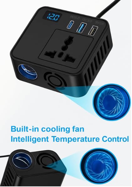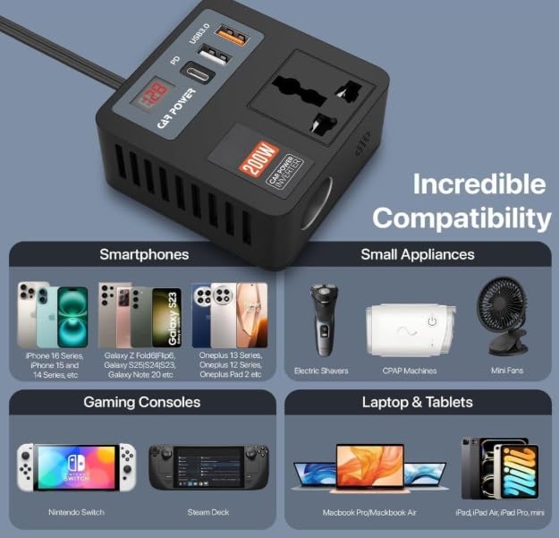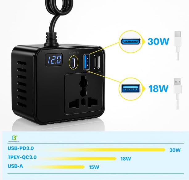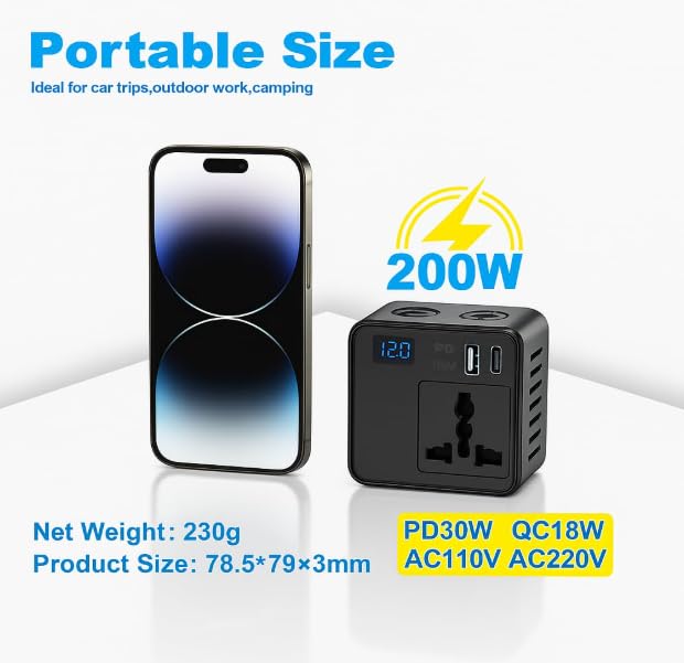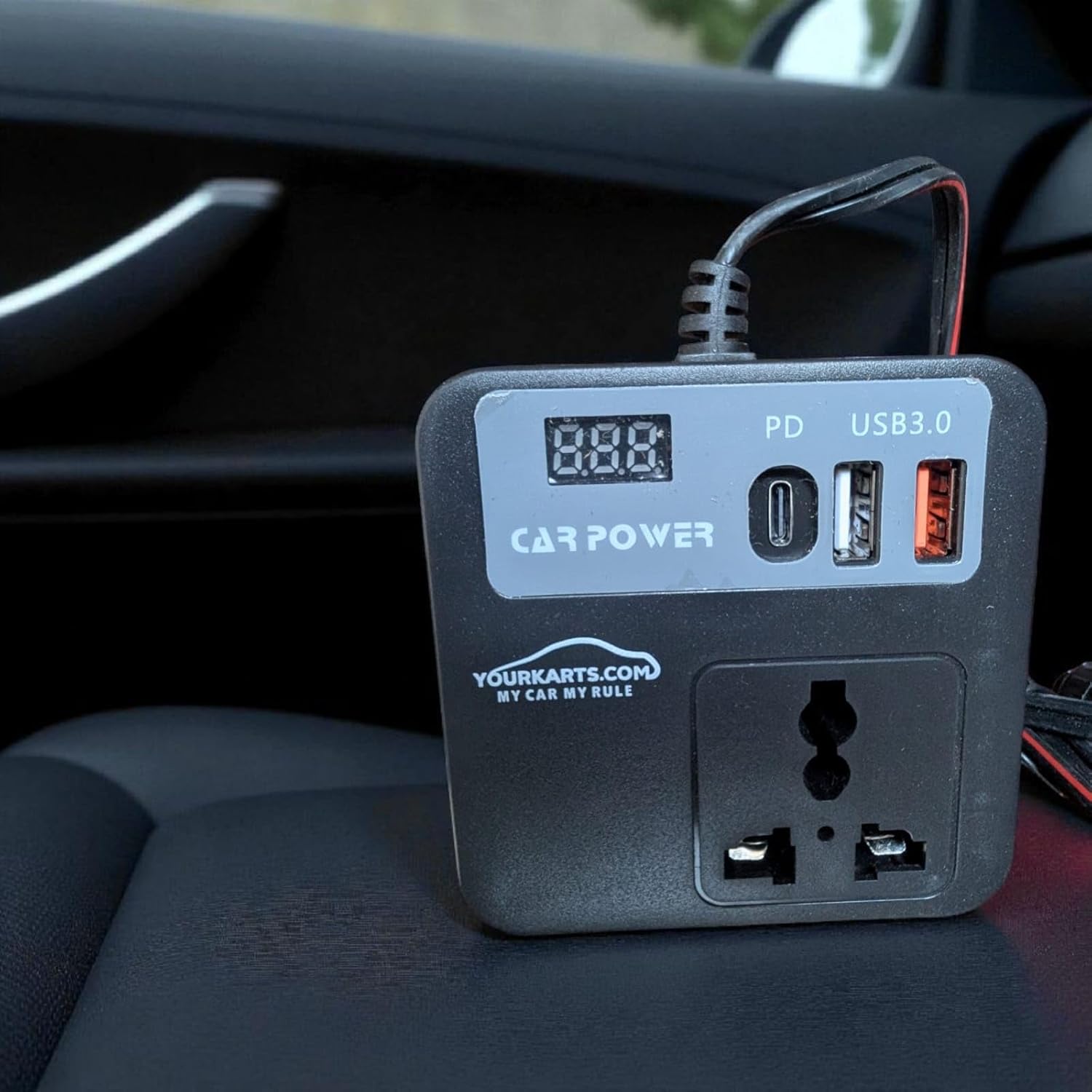 YOURKARTS.COM 200W Car Power Inverter 12V DC to 220V AC Converter with 3 USB Ports|6.2A Max|1 Type-C Fast Charging Port | Car Laptop Charger Power Adapter for Mobile|Gadgets LCD Display