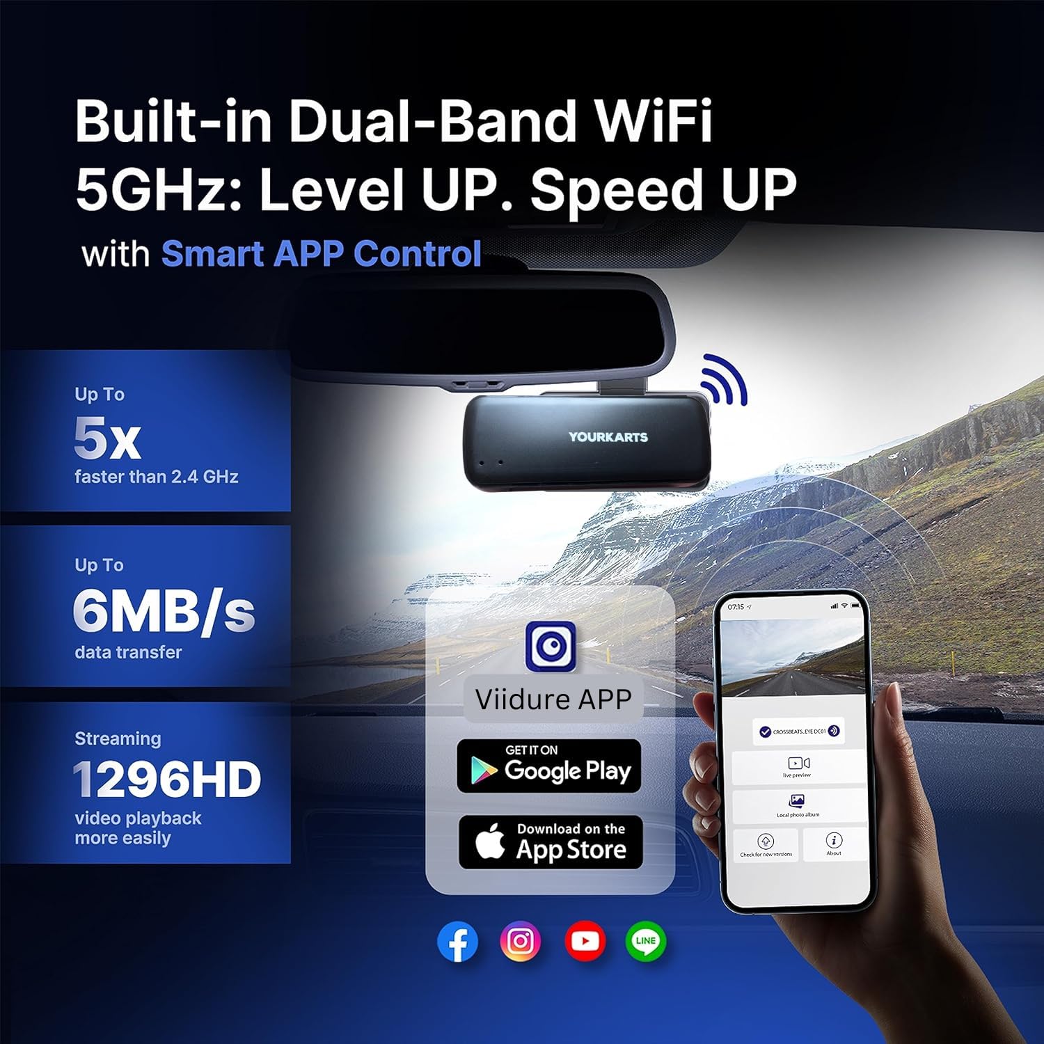YOURKARTS.COM L16 Compact HD Dash Cam 1296P/1080P with WiFi & Viidure App, Motion Detection, 128GB Support, Wide Temp Range, 12V-24V Compatible – 18-Month Warranty