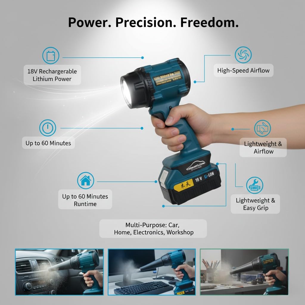 - 18V Rechargeable & Cordless Design: Features an upgraded 18V battery system for longer runtime, faster airflow output and convenient cordless cleaning—perfect for car detailing, office and home use.