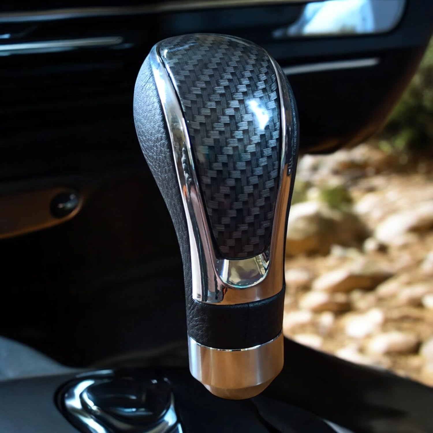 YOURKARTS.COM Premium Carbon Fiber Gear Shift Knob, Black Leather Trim with Chrome Accent, Universal Fit (0536 Carbon Finish)