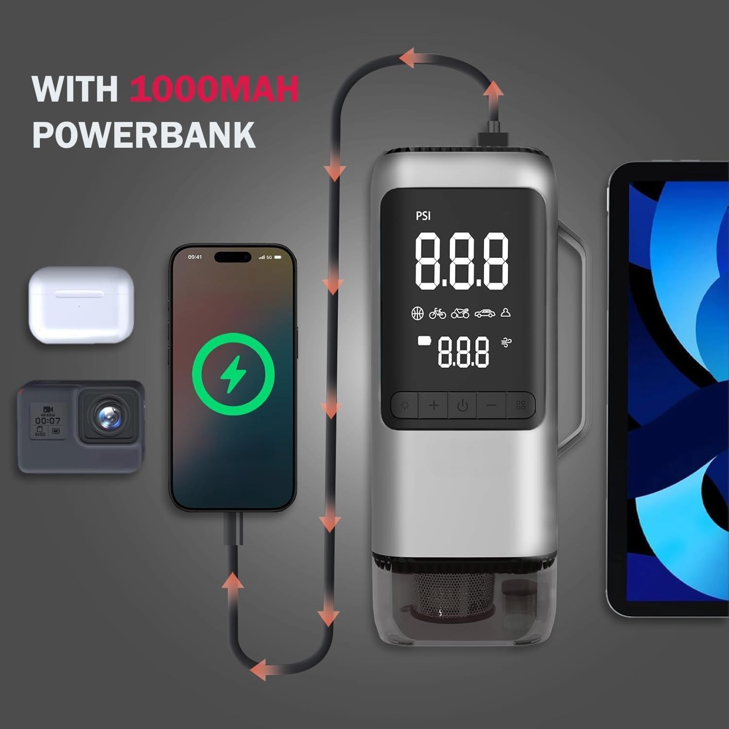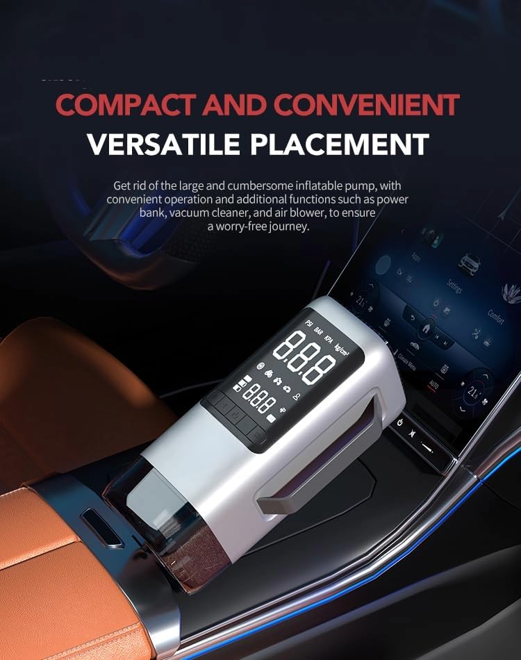 - 3-in-1 Multifunction Device: Combines a powerful 150 PSI air compressor, 5000 Pa cordless vacuum, and 3000 A peak jump starter for cars, bikes, SUVs, and more.