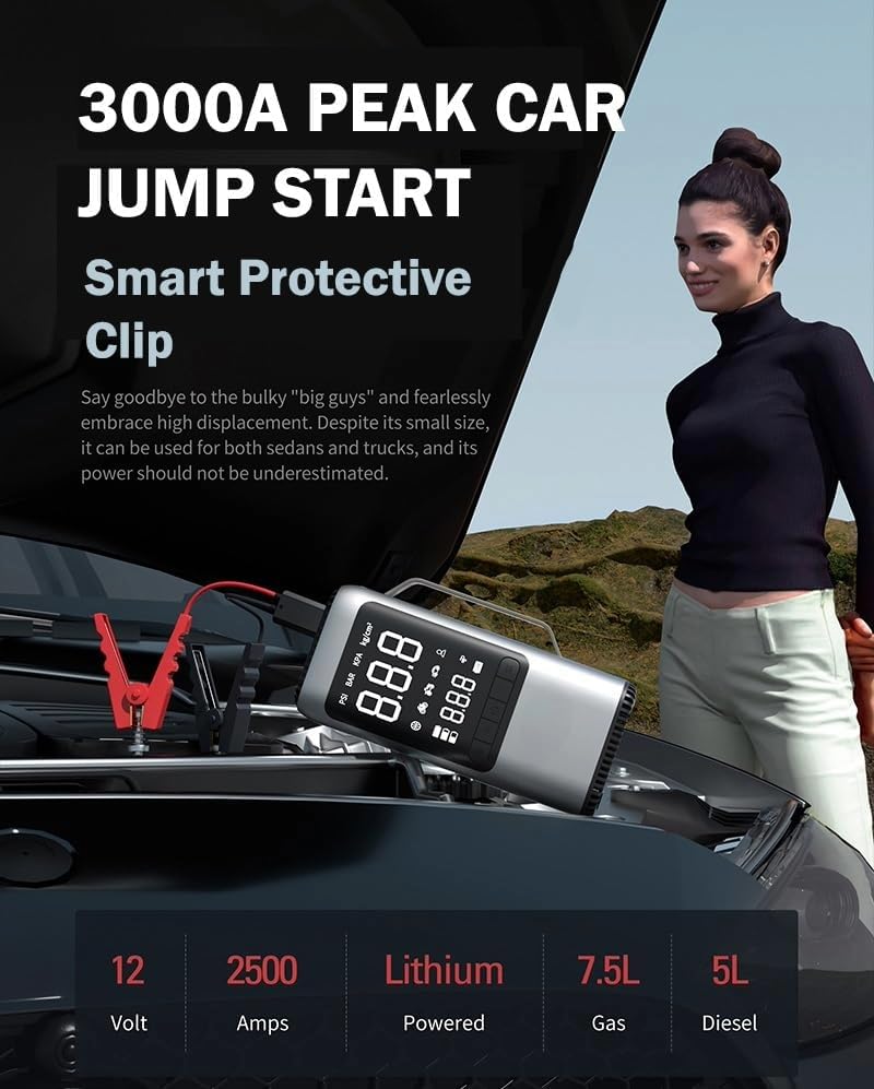 - Reliable Jump Starting: Instantly jump-starts vehicles up to 6.0 L gas or 3.0 L diesel engines with 1000 A starting current and 3000 A peak—ideal for emergencies and road trips.
