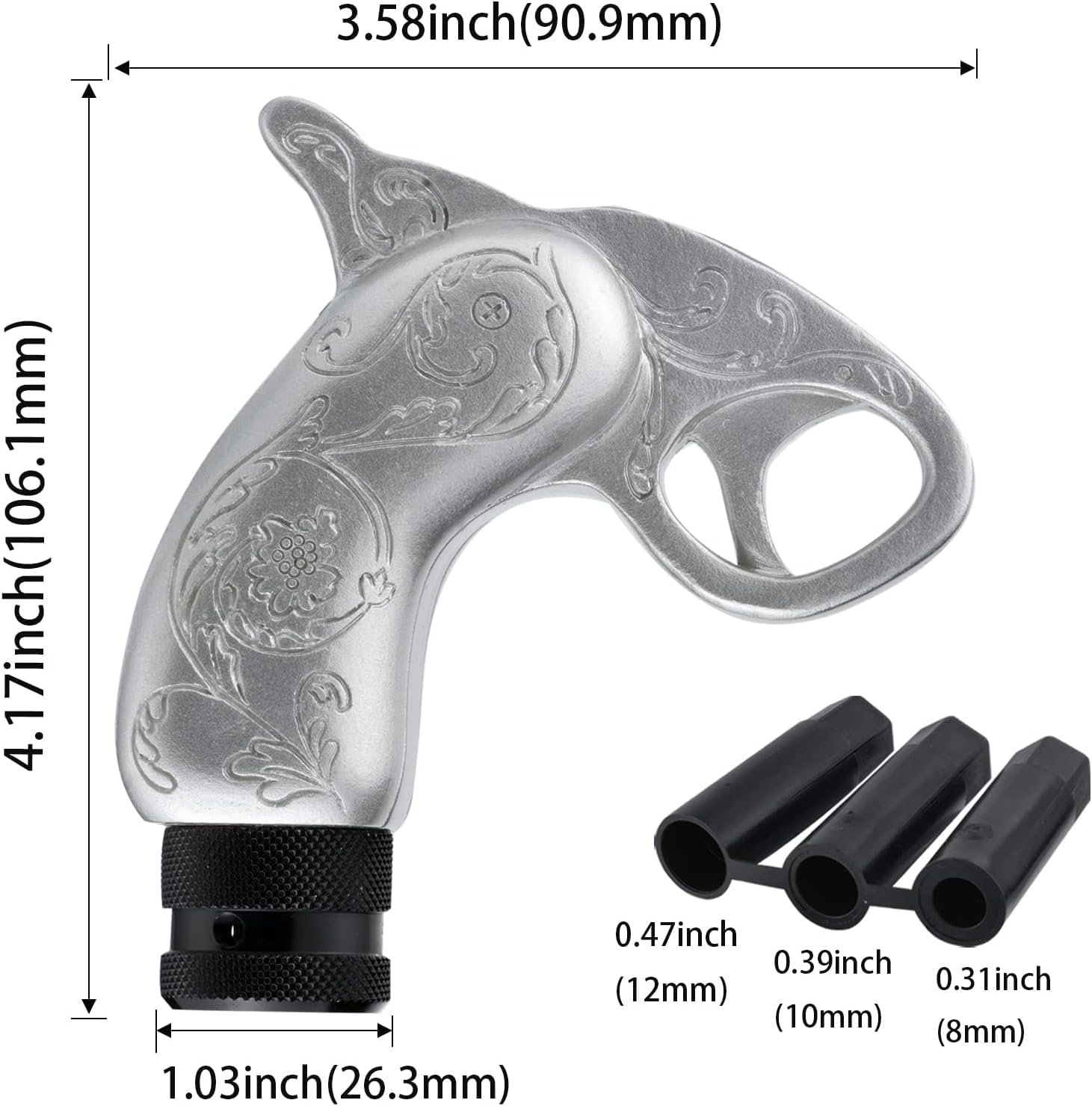 - Product Size: This car shifter size is 3.58*4.17 inch(90.9*106.1mm), and package with 3 universal adapters size are 0.31inch, 0.39inch, 0.47inch (8mm,10mm,12mm).